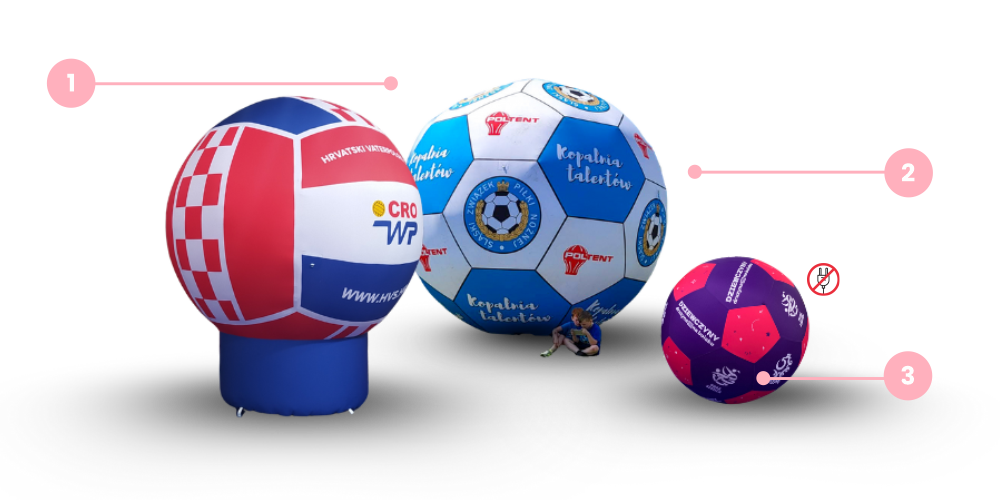 Wyróżnij się podczas wydarzeń sportowych i plenerowych dzięki balonom w kształcie piłki. To nośniki, które można postawić, nadmuchać z wentylatorem lub puścić w ruch! Lekkie piłki VENTO® to hit wśród najmłodszych, a większe modele świetnie sprawdzają się jako tło do zdjęć i reklama widoczna z daleka.